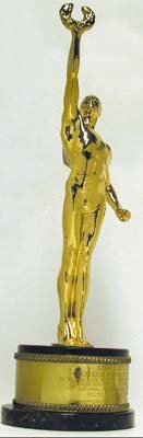 The Victor Awards are an acknowledgement of outstanding athletic achievements in Sport. The award, regarded as the sporting equivalent of the Academy Awards, is presented at a lavish affair held in Las Vegas each year. A single award is presented for each sport. This towering fig-ural trophy in gleaming gold plate is mounted on a substantial black mar-ble base. The attached plaque reads, in part, "Guy Lafleur, Comeback Player of the year, Victor Awards XXIII 1989". In excellent condition. From Guy's collection with an LOA signed by him