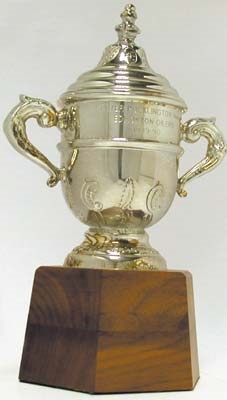 This prestigious trophy, in memory of former NHL President Clarence Campbell, is awarded annually to the players and staff of the Championship team in the conference bearing his name. This example was presented by the National Hockey League to Oilers owner Peter Pocklington. Engraved into one side of the silver plate cup is "Clarence S. Campbell Bowl, 1968" with "Peter Pocklington, Owner, Edmonton Oilers, 1989-90 on the other. Brown felt covers the bottom of the wood base, with manufacturer's decal. Letter of Authenticity signed by Mr. Pocklington. In excellent condition.