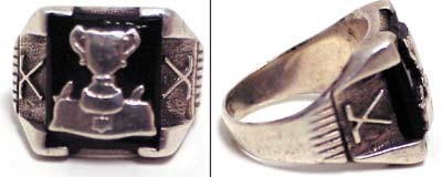 The age-old Memorial Cup pits the top junior level Canadian teams against each other in a post-season battle of hockey supremacy. In 1965, Bobby Orr and his Oshawa Generals bowed out to Bernie Parent, Derek Sanderson and the Niagara Falls Flyers in the final series. This silver ring, presented to each member of the Generals, features the image of the Memorial Cup set atop a black stone on the table, with crossed hockey sticks on each shank. The inside is inscribed "Oshawa, Finalists, 1965" with the Sterling mark. In very good condition. Compare yours to Bobby's when your paths cross!