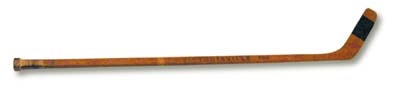 Late Sixties Victoriaville Pro handled by Hall-of-Fame blueliner Brad Park at the very beginning of his 17-year NHL career. Stamped "Park" on the upper shaft with the number "2" added in black marker. Knob taped in aged white over black "bulldog" with more of the heavy black tape on the blade. Wood has darkened over the years but the stick is in great shape.