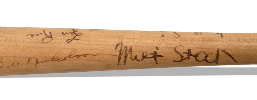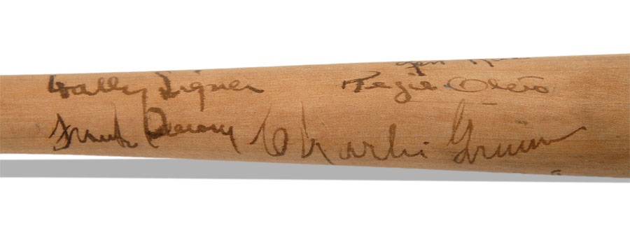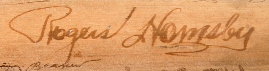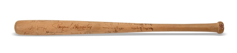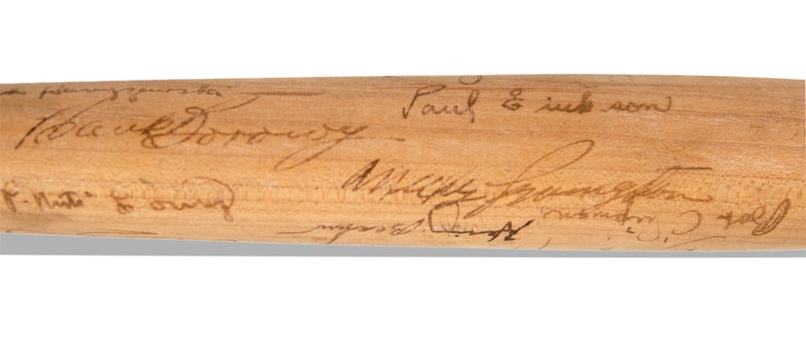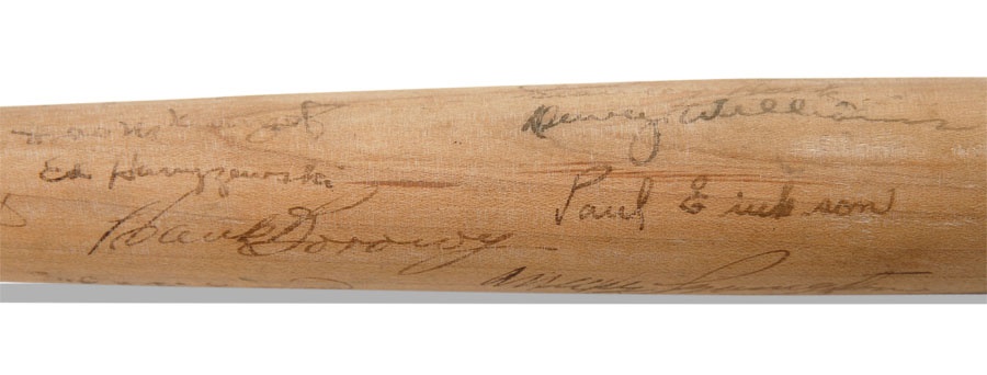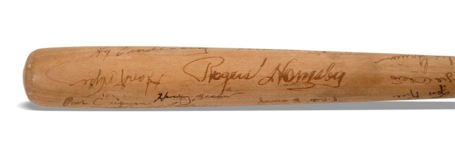 Boasting roughly 25 names, this 16.25”-long bat includes the autographs of Hank Bowory, Charlie Grimm, Paul Derringer, Andy Pafko, Ed Sauer, Peanuts Lowrey and a big, beautiful Rogers Hornsby signature front and center. The signatures are overall EX and the Hornsby is the best of all at EX-MT. Due to the appearance of "The Rajah" on the bat, it may have been signed during the 1945 World Series at Wrigley Field. Hornsby won two triple crowns, and his lifetime batting average of .358 is second only to Ty Cobb's.