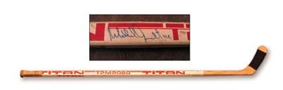 Michel Goulet's Titan TPM 2020 from the 87-88 season (48 goals). Stamped "M. Goulet" with correct factory coding and his number "16" marked twice. Great use! Signed once in blue Sharpie and again in ink.