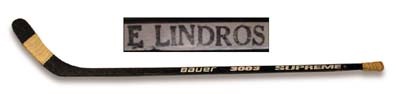 Early black & white Bauer Supreme stamped "E. Lindros". Correctly taped in white with a chunky handle. Good use with no significant damage.