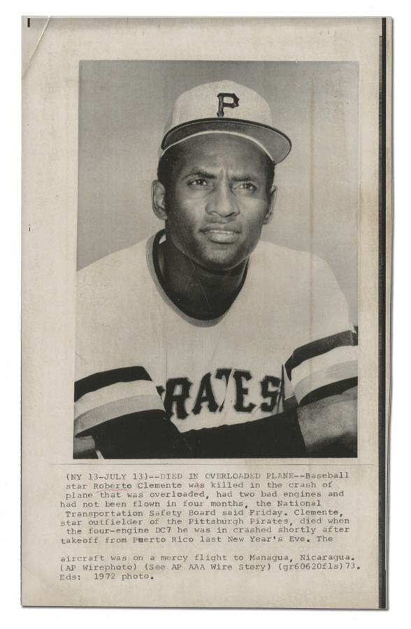 This early laser image shows great portrait of Roberto. It announces he has died in the infamous plane crash. It measures approximately and has a creased corner but is otherwise EX+.