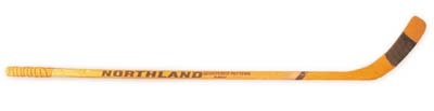 Four Art Ross trophies, a pair of Hart's, two Byng's and 541 goals. This mid-Seventies Northland Registered Pattern was used by Stan Mikita towards the end of his sparkling career. Stamped "Mikita" on both sides of the shaft, with "Gunzos" and pattern "7126". Gauze-wrapped grip with black tape on the blade. A slight toe chip took this one out of active service.
