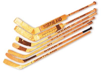 Vintage collection of gamers straight out of the locker room at the ol' Boston Garden. Goalie sticks from John Adams (rare) and Gilles Gilbert and four more used by fan-favorite Wayne Cashman, Gary Doak, Dwight Foster and Bobby Schmautz. All are taped up and show good use. Condition varies with a few cracks here and there. Also included is an unused Roberts stick, signed along both sides of the shaft by nineteen Boston Braves with Terry O'Reilly (some smudged signatures).