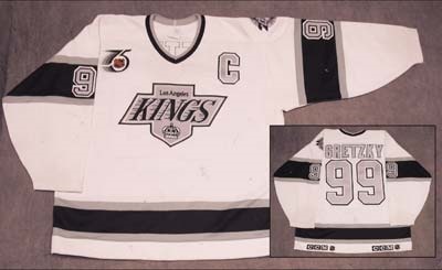 No need to sell you on the player - let's get right to the shirt! White CCM knit Los Angeles Kings home uniform worn by Wayne Gretzky during the 1991-92 NHL season. Commemorative cresting include the NHL's 75 Anniversary patch and another marking the 25th Anniversary of the Los Angeles Kings. Storied number "99" on the back and sleeves with Wayne's "C" on the left breast. Numbers and lettering are done in three colors with the name-on-back in letters stitched directly onto the shirt. Inside hem features expected customizations with the black Velcro strip and a "99" patch done in the same font as the back numbers. Double NHL shield and CCM embroidered onto the tail and the fight strap has been cut out (another Gretzky trademark). This gamer was custom tailored for Wayne and has the bell-cut body and shorter, wider sleeves. The game use on this jer-sey is a treat! Numerous stick slashes on the sleeves and body in various shades including a few white and red marks. Pilling appears on the exterior under the chin and again inside with heavy areas on the hem and in the elbows. The shirt displays slight staining on the cuffs, beneath the v-neck and in the armpits. Wondrous wear for a Kings jersey! This shirt has been examined by the best in the business and comes to you with two separate Letters of Authenticity.