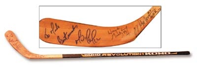During the final match-up between the Penguins and the Rangers of the 1996-97 regular season, Mario Lemieux and Wayne Gretzky faced each other for what was to be the last one-ice meeting of these two sporting Greats. Soon after the match, held at MSG in NY, Mario would walk away from the game and make his comeback only after Wayne's Final Farewell. This Koho Revolution, used by Mario Lemieux that night, has been signed "to Mike" on the blade by Mario Lemieux, Wayne Gretzky and Mark Messier. The signatures are full and bold, obviously penned with great care. Correctly stamped and taped with the added game code "N.Y." in marker on the end of the knob. From the collection former New York Rangers equipment manager Mike Folga.