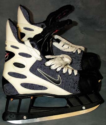 Battered pair of Nike Zoom Air boots and blades carried the Great One around the rink during his first season in New York. Custom sizing (6 3/4 EA and 7 1/4 EAA) although they seem to measure out the same size. The rolled tongues are a Gretkzy trademark as are the black Perfecta blade holders, Wayne's preferred style dating back to 1980. Well worked-in with numerous marks and slashes… no doubt this pair felt good on those famous feet. From the collection of Former Rangers equipment manager Mike Folga.