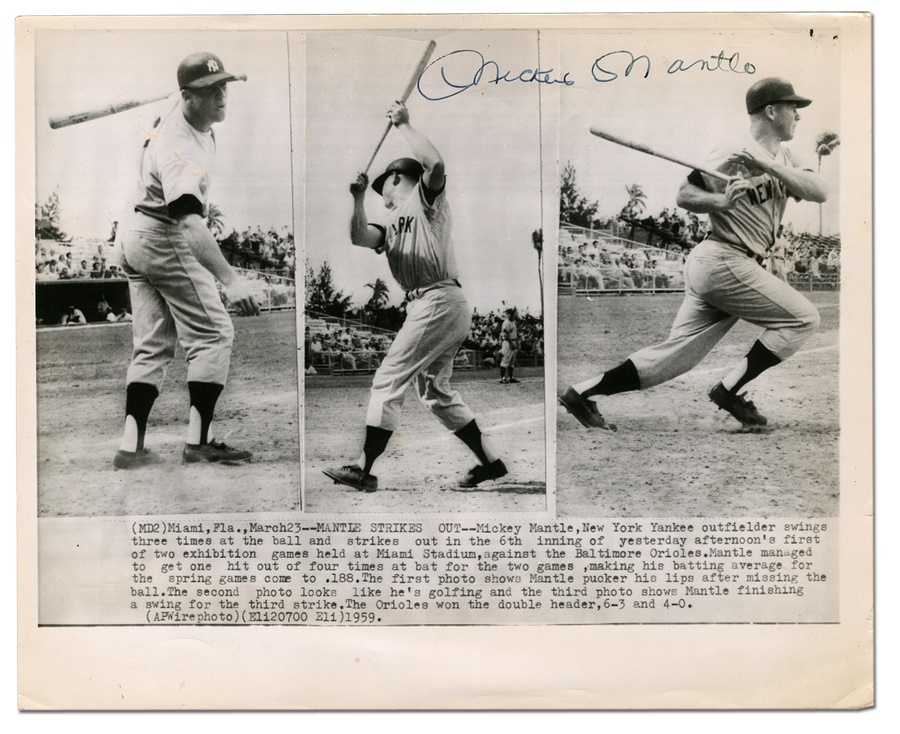 This three-panel AP wire photo of Hall of Famer Mickey Mantle swinging the bat in spring training of 1959 was signed by "The Mick" in 8/10 blue ink around the same time. The photo is in EX condition and comes with an LOA. A 16-time All-Star, Mickey Mantle played all 18 of his major league seasons as the center fielder for the New York Yankees, winning seven World Series and three MVP awards. He is regarded as the greatest switch-hitter of all-time.