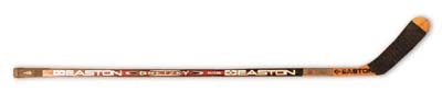 Easton Aluminum Silvertip model marked "Gretzky" with an Easton wood blade. The blade, also stamped "Gretzky", is wrapped in Wayne's distinctive style and taped in bulldog. The black foam "Gripper" is there instead of a taped knob and the butt end has been coded with "ANA 97 LZE" in black marker. Better than average use on this rare style Gretzky gamer. A short crack appears where the blade meets the shaft.