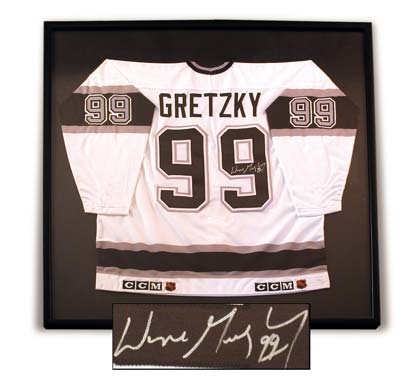 Correctly crested and numbered pro weight game jersey signed on the back by the Great One. Double CCM replica LA Kings captain's uniform in home colors the UDA holo-gram attached. Mounted and framed to 40"x40" in size.