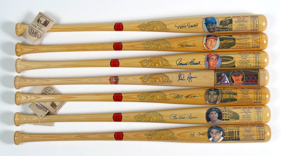 Seven autographed bats from the Cooperstown Bat Co.'s "Famous Player Series". Each bat features the player's signature in 9/10 blue Sharpie next to a small color portrait of themselves and a brief player bio, including career statistics. Each bat comes with a COA from Cooperstown Bat. Co. and a serial # in original numbered envelope. The 32 oz. 34" bats feature the signatures of Stan Musial, Johnny Bench, Carl Yastrzemski, Nolan Ryan, Ernie Banks, Yogi Berra and Pee Wee Reese. Only 1,000 of each bat was produced. Overall condition is NRMT-MT.