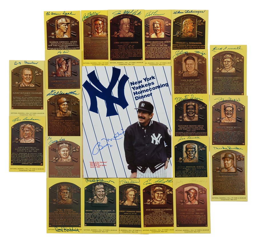 Fine collection of signatures with 59 total, 21 different. Includes: Berra, Boudreau (10), Chandler (5), Doerr, Feller (5), Ferrell (2), Gehringer (5), Hubbell, Hunter (2), Irvin (3), Judy Johnson, Kell (10), Lemon (5), Mathews, Musial, Brooks Robinson, Slaughter, Snider, Spahn, and Sewell. Overall condition is NRMT (most are mint). Plus, 1983 Billy Martin Yankees Homecoming (again!) Dinner Program signed on front by Billy in mint blue Sharpie.