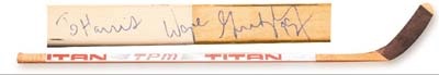 Gretzky did his best work with the familiar red and white Titan TPM 2020. This example was used on January 24, 1984 according to a notation in ballpoint on the back of the shaft. Wayne scored 87 goals in 83-84 on his way to his first Stanley Cup. Stamped "W. Gretzky" with the pen-cil factory code "WG" and stamped "Jan 4 1984" date on the shaft. White knob tape over black with blade taped in baby-powdered "Bulldog". A perfect example of a game used Wayne Gretzky stick from his Edmonton days. Shows decent use with no cracking. From the collection of LA Kings bench man Harris Peet.