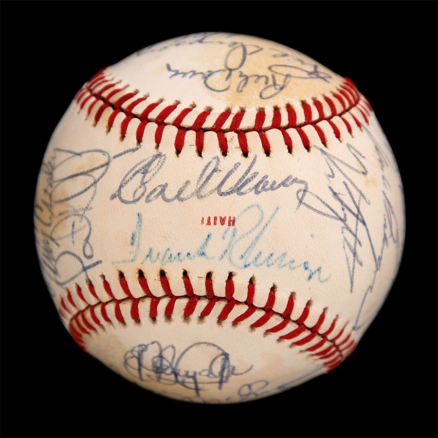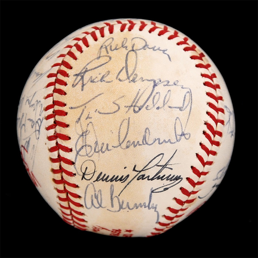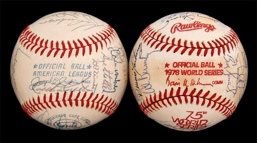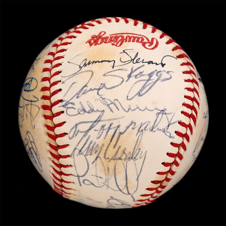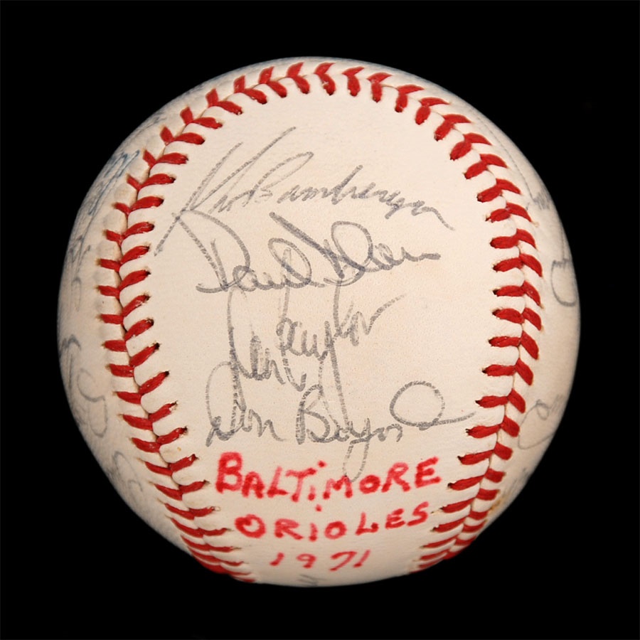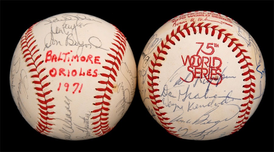 Both of these baseballs are from years that the Orioles won the American League Championship. The 1971 ball is an Official American League baseball. It is NRMT while the ink signatures average 7/10. Key signatures are B. Robinson, Powell, Weaver, Blair and Johnson. The 1979 team is on a 1978 World Series baseball and has some toning. The signatures in blue and black pen average 7.5/10. Key signatures are Bumbry, Martinez, Dempsey, Murray, Weaver, F. Robinson (coach), Ripken Sr. and Stewart.