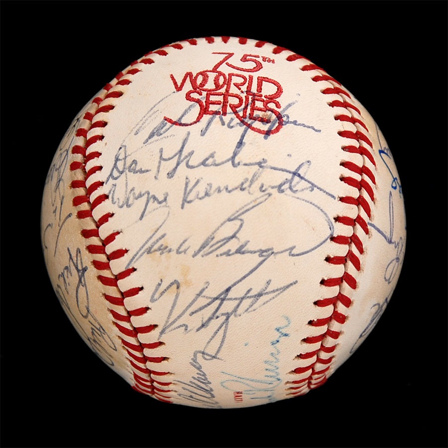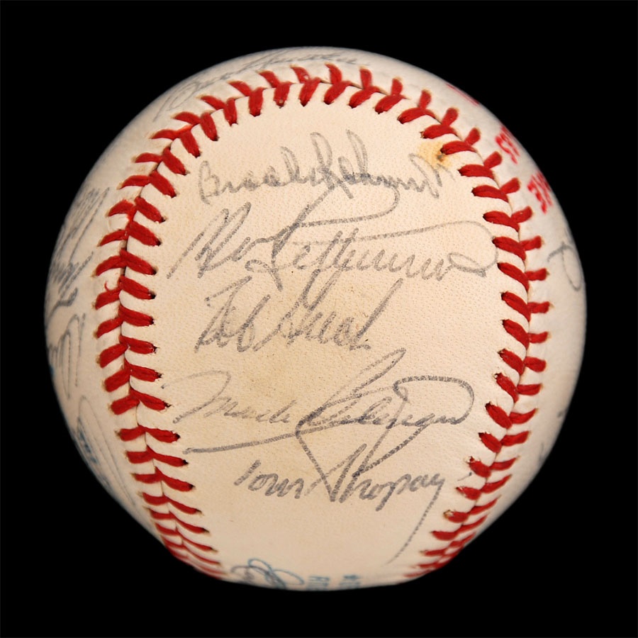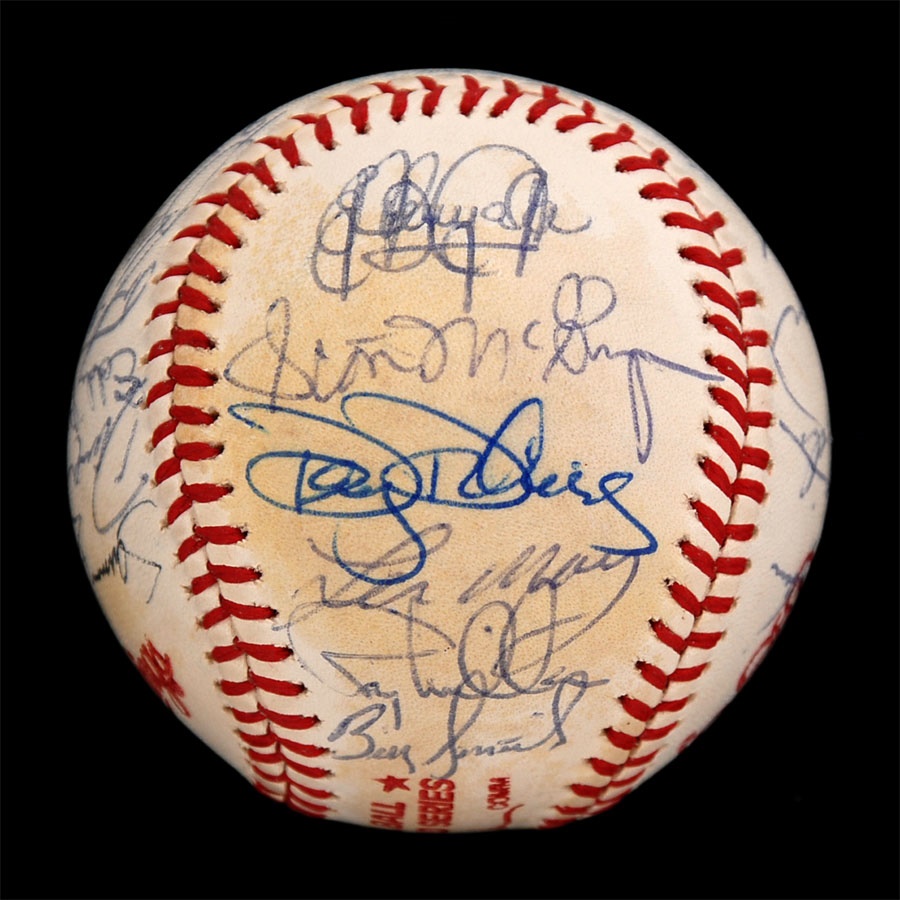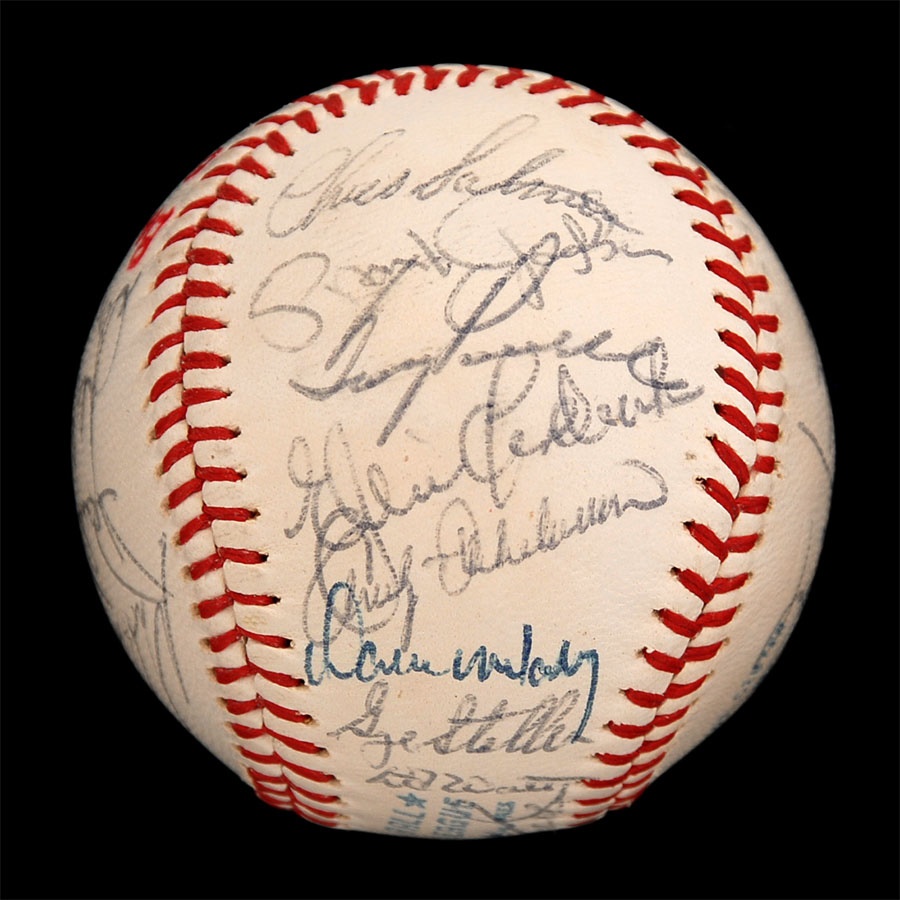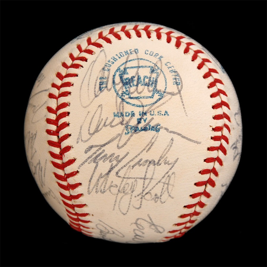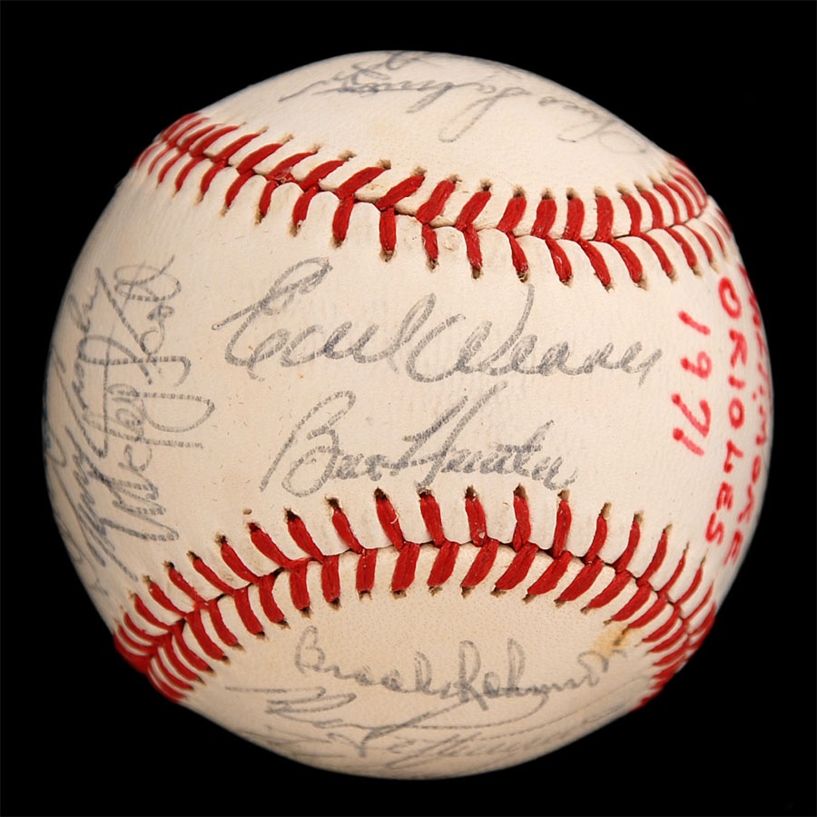 Both of these baseballs are from years that the Orioles won the American League Championship. The 1971 ball is an Official American League baseball. It is NRMT while the ink signatures average 7/10. Key signatures are B. Robinson, Powell, Weaver, Blair and Johnson. The 1979 team is on a 1978 World Series baseball and has some toning. The signatures in blue and black pen average 7.5/10. Key signatures are Bumbry, Martinez, Dempsey, Murray, Weaver, F. Robinson (coach), Ripken Sr. and Stewart.
