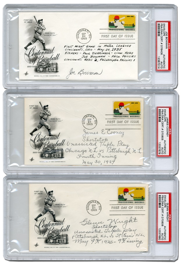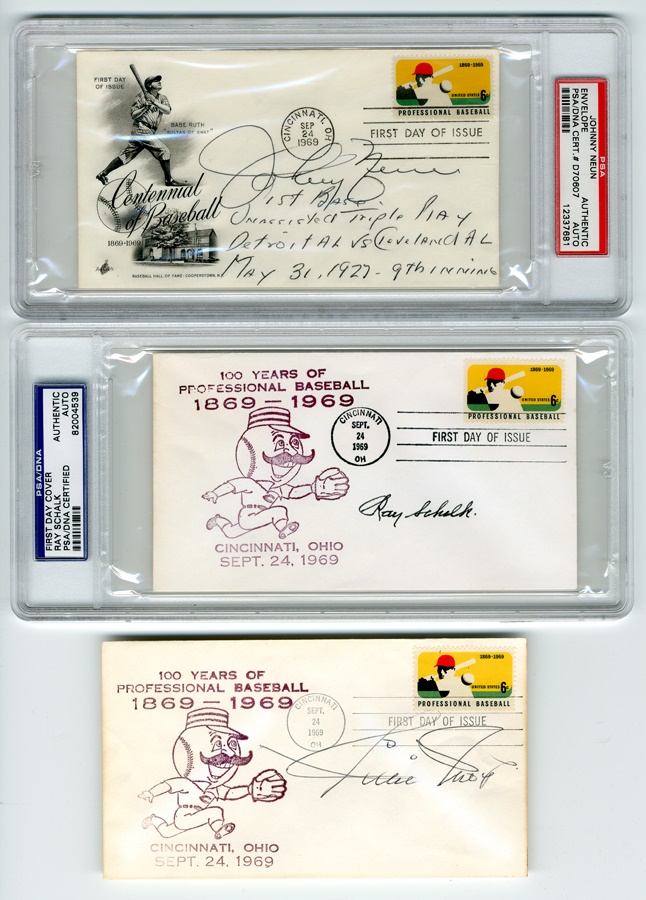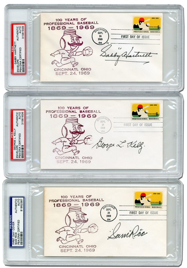 These nine vintage First Day covers are postmarked 1969 to commemorate the 100-year anniversary of baseball. They average EX-MT and eight are signed with notations of the player accomplishments. Among the autographs are Willie Mays, Joe Bowman, Glenn Wright, James Cooney, Johnny Neun, Sam Rice, George Kelly, Gabby Hartnett and Ray Schalk. Each but the Mays is encapsulated by the Postal Service of America, with signatures averaging 8/10.