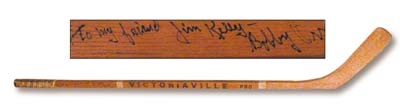 Once handled by the greatest defenseman to play the game, this Victoriaville Pro model game stick is instantly recognizable to his fans and collectors alike. Bobby Orr's distinctive ribbed white tape handle has darkened with age, as the oils from the rolled black bulldog tape underneath have seeped through over the years. This "Special Model" does not display the name stamp as it is probably up under the knob tape. The blade on this particular model was left untaped, evidenced in many action photos from the period. Bobby has added a bold inscribed signature on the shaft.