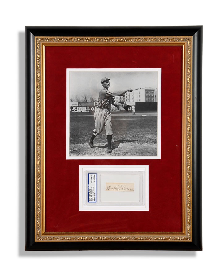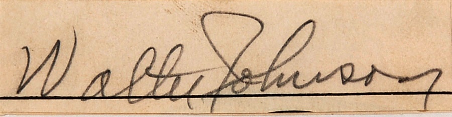 Fabulous pencil signature of the Big Train has been encapsulated by PSA/DNA for authenticity and freshness. Has been lovingly framed with an excellent image of the hurler pitching in his prime which is a modern print but looks just as good as the original. Signature rates an 8/10and is ready for your personal Hall of Fame.