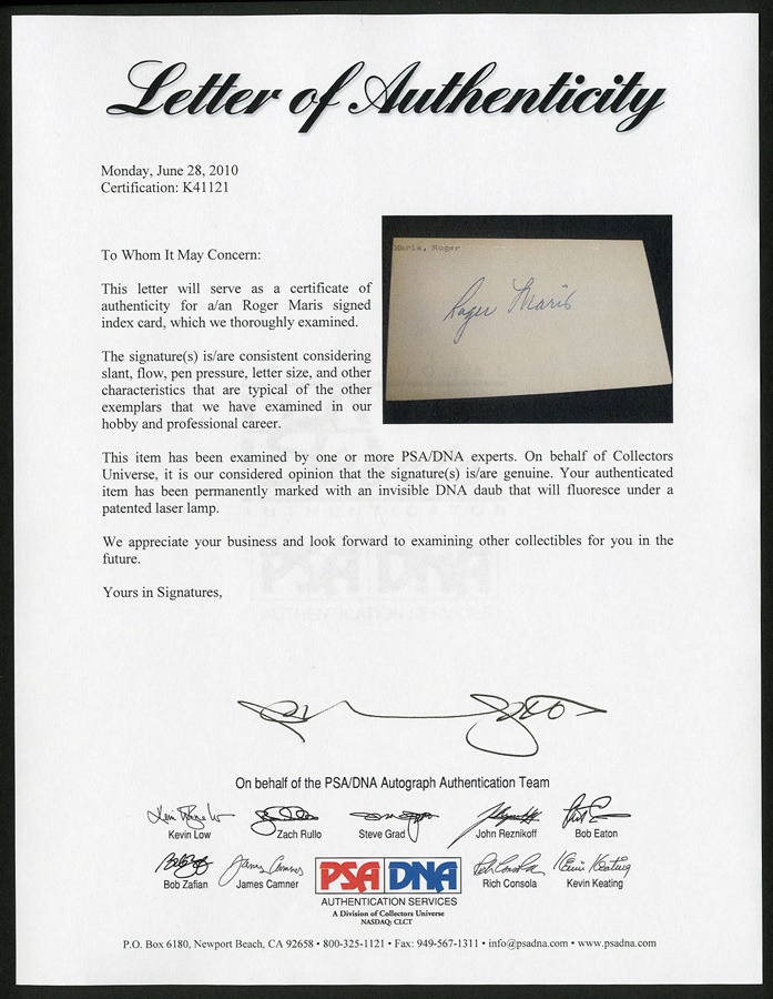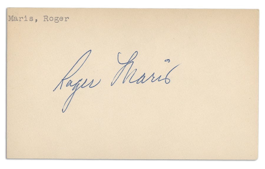 The man who held the major league home run record for 37 seasons, Roger Maris, affixed his signature in 9/10 blue ballpoint pen to this 3"x5" index card circa 1957-58. The name is also typed in the upper left-hand corner and is in EX-MT condition. Contains PSA and LOA. A seven-time All-Star, Maris played 12 major league seasons, primarily with the New York Yankees, for whom he helped win two World Series.
