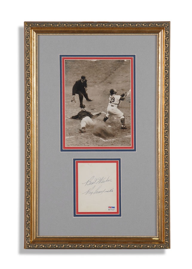 This beautiful signed autograph album page is framed and matted with an 8.5x6.5" photo of Campanella catching in 1956. The signature is large and in blue pen, 8/10. The photograph, from the United Press, is captioned on the back of the frame: "Brooklyn, N.Y.: Dodger catcher Roy Campanella waits for the ball (top right), thrown from the outfield by Duke Snider as Giants hurler Johnny Antonelli scores in the second inning on Don Mueller's hit during the first game of the Brooklyn-New York Twilight-Night doubleheader here September 7th. Antonelli overcame the Ebbets Field Southpaw Hurler's jinx to defeat the Dodgers 6-2. The umpire is William Engelen." The framed piece is approximately 22x14". PSA LOA.