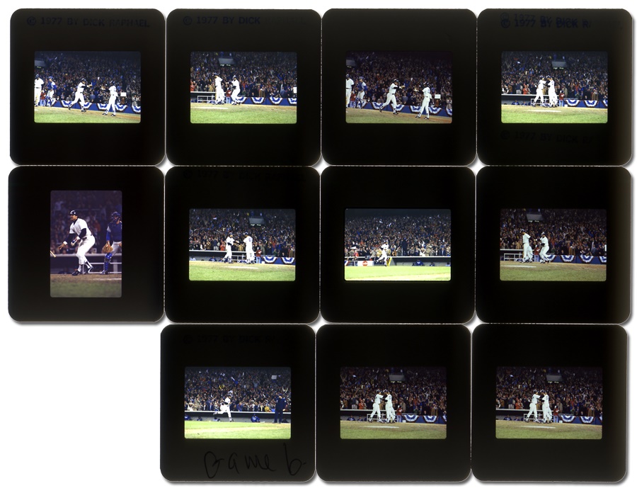 Original chromes by Sports Illustrated photographer Dick Rafael. These are one-of-a-kind chromes (original negatives). They each show one of the three home runs he hit that red letter day at Yankee Stadium. Total of eleven action slides show him in thunderous batting action poses in the midst of these important homers. 35mm, NRMT, and some have the photographer’s stamps on holders.