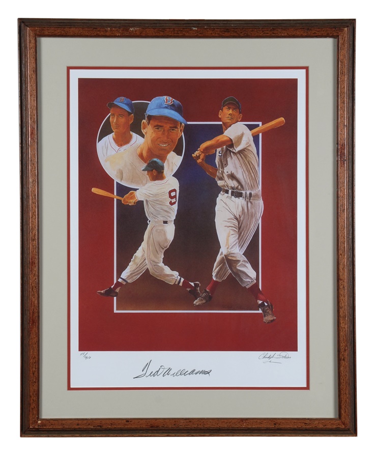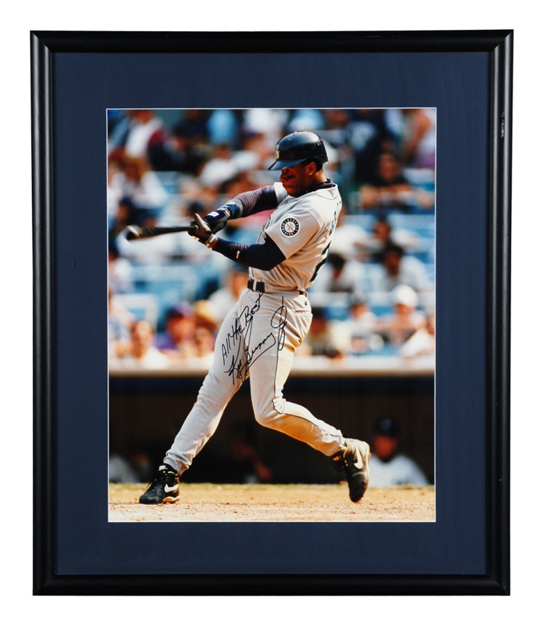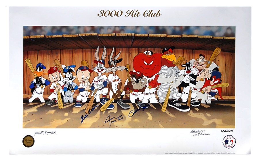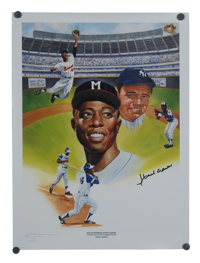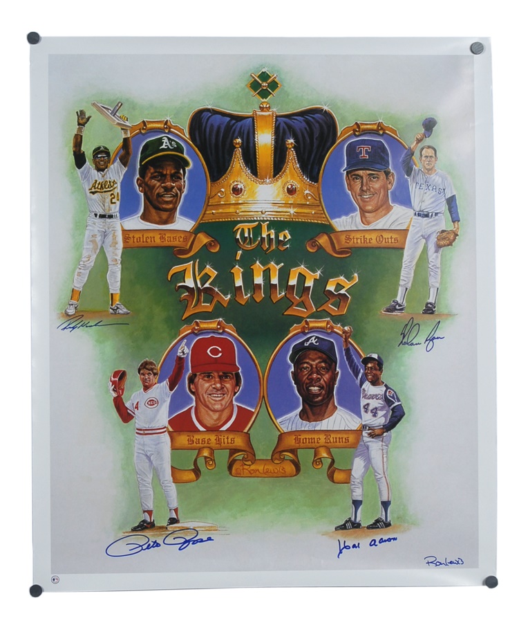 A fine collection of oversized photos includes Ken Griffey Jr., Tony Gwynn (2) and Brian Jordan. Posters include a theme called "The Kings" signed by Pete Rose, Hank Aaron, Rickey Henderson and Nolan Ryan. There's also a single poster signed by Aaron. Prints include Ted Williams (limited edition 115 of 406) and Looney Tunes 3,000 hits signed by Aaron, Mays and Rose. Signatures average 8/10 while items average EX-MT to NRMT.