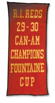 Massive 12-foot banner in red and black felt hung for decades from the rafters in the home arena of the Rhode Island Reds Hockey Club. Giant cream felt letters pronounce "RI Reds, 29- 30 CAN-AM Champs, Fountaine Cup". In excellent condition considering its age.
