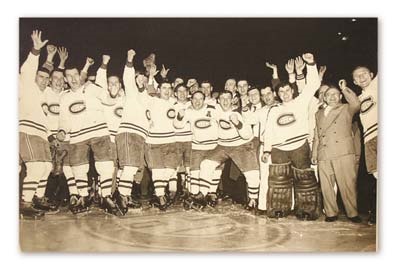 Vintage David Bier Studios photo captures the jubilation of the Montreal Canadiens moments after they captured the Stanley Cup in 1953. Pictured among the group are Habs stars Plante, Richard, Geoffrion, Lach, Geoffrion and Moore. Seldom seen image of celebration. In excellent condition.