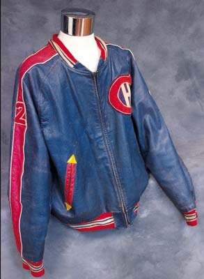 Beautiful blue leather team jacket worn by Hall of Fame Habs defenceman Jacques Laperriere during the Sixties. Solid leather body and sleeves with elasticized cuffs and hem and the heavy chenille logo of the Montreal Canadiens on the left breast. Lappy's number "2", again in thick chenille, appears on each sleeve. Manufactured and tagged by Murray Randolph, Montreal. Measures out to a mens size 48. Well worn, in excellent condition.