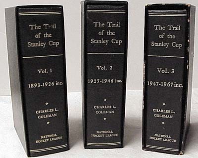 The definitive work on the game of hockey. Massive three-volume leather-bound boxed limited edition of Charles Coleman's "The Trail of the Stanley Cup", presented by the National Hockey League to "the Family of George Boucher" according to the attached bookplate. Boucher, a member of the Hockey Hall of Fame (d. 1960), played for the Ottawa Senators, Montreal Maroons and Chicago Blackhawks over a 17-year career. In excellent condition.