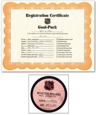 During the early 1970's the NHL instituted a program whereby the pucks used to score each and every goal in NHL play were collected, labeled and marketed to the public. This Converse Montreal Canadiens game puck is labeled "Boston Bruins, Phil Esposito, 11/29/72. The accompanying NHL Certificate lists additional infor-mation including the assist credits. From the personal collec-tion of long-time Bruins trainer John "Frosty" Forristall.