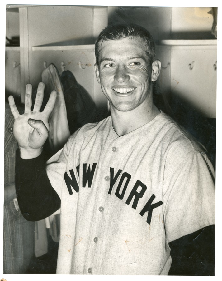 Mickey holds up four fingers to represent the number of runs he drove in with his grand slam in the 1953 World Series. Sumptuous silver gelatin print with dramatic shadowing. Original newspaper article is affixed to the verso. Condition is EX-MT. Measures 13x10.5”.