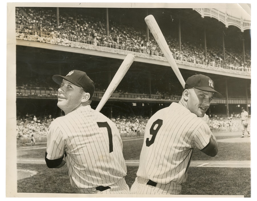 Image we have not seen before from the famous Home Run Twins photo shoot. The main image was used for the “Safe At Home” movie poster and in many other forms. In this one, Mantle is jockeying for the camera in a light moment after hitting home run #39 in pursuit of the Babe. Published in the New York Daily Mirror with original newspaper article affixed to the verso.  Crease at top left but is o/w EX. 11x14”.