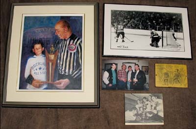 An assortment of items remaining from our April auction of the Guy Lafleur Collection: 1) Pair of Quebec Nordiques blue game used socks. 2) Framed photo (14"x22") of Guy's 60th goal of the 1978 season. 3) Framed and matted presentation photo of the 1976 Canada Cup Team Canada squad. 4) 1960's painting in oils portraying Guy in his Thurso All-Stars accepting the MVP award from Red Story at the Quebec International PeeWee Tournament. 5) Collection of 34 wood-mounted photo plaques from a museum display covering the highlights of Guy's career.