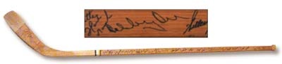 Darryl Edestrand's game used Northland Pro from the 1975-76 season, Bobby's last with the Bruins. A parade of Beantown's best marches down the shaft with Orr, Brad Park, Terry O'Reilly, Wayne Cashman, Gilles Gilbert, John Bucyk, Jean Ratelle and Don Cherry. 22 sigs in total. A few show smudging but overall the autographs are dark, bold and uniform… one of the most attractive team signed sticks around. The Orr is perfect!