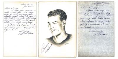 Original signed pencil drawing of a young Gordon Howe by noted artist and celebrity autograph collector Lucille Audette. Audette had a unique method of collecting… she would sketch her subject and mail the finished art-work to the celebrity to be signed. This collection consists of the 6x9' pencil drawing signed by Howe and a pair of handwritten letters from Gordie to Lucille, one from 1950 signed "Gordon Howe" and another from the following year signed "Gordon". Near mint in an archival folio.