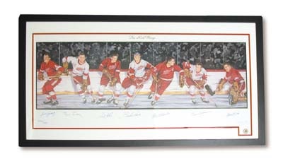 The finest players ever to don the winged wheel are depict-ed in vibrant red across the width of this striking limited edi-tion print. Olympian greats Harry Lumley, Norm Ullman, Alex Delvecchio, Gordon Howe, Sid Abel, Ted Lindsay and Bill Gadsby have all signed below their images. Professionally framed and matted, numbered 820/1000.