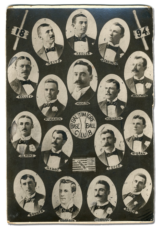 Magnificent display photo of these Temple Cup competitors at their finest. Stirring cornucopia of ovals feature such legends as Hanlon (center), Gleason, Clarke, Kelley, Robinson, Brouthers, Jennings, Keeler, and more. 100% vintage original is one we have not seen before. Mounted on heavy board. It is overall excellent, other than some wear to the edges and a crease on the back mount that does not go through to the photograph. Publishing notes on the back as well. 13.5x9”.