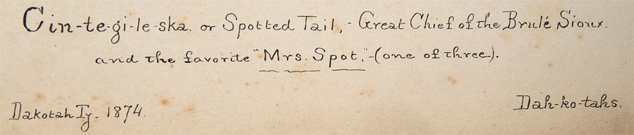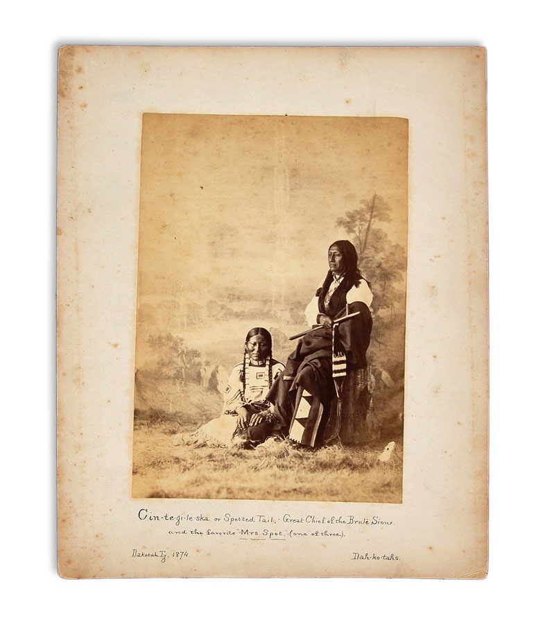 A magnificent photograph and hand-writing combination shows Spotted Tail, Great Chief of the Brule Sioux, and wife "Mrs. Spot". Spotted Tail sits atop a log, looking off-camera while his wife lays at his feet, looking towards the camera. The real charm of this 5x7" image are the handwritten notes at the bottom, which include syllabic pronunciation of Spotted Tail's true name, "Cin-te-gi-le-ska", an explanation that his wife "Mrs. Spot" is his "favorite" (she is one of three), and the dating/location, which indicates this photo was taken in 1874 in the "Dakotah" Territory. Overall condition is EX with a near-perfect image.