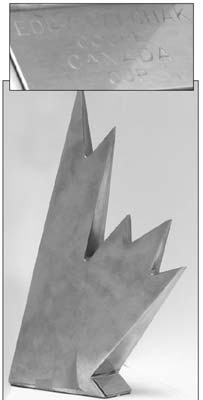 Three-dimensional demi-leaf award, in silver plate, pre-sented to members of Team Canada after their victory over the Czechs in the 1976 Canada Cup series. This substantial trophy was presented to team trainer Eddy Palchak as noted on the silver plaque attached to the base. In excellent condition. From the collection of for-mer Canadiens trainer Eddy Palchak.