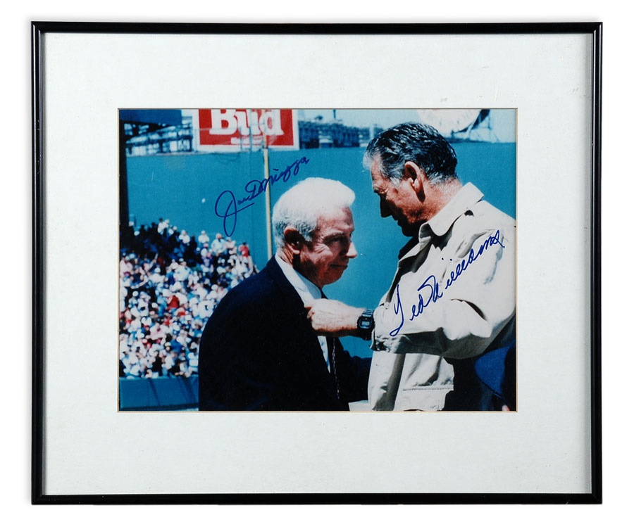 Joe DiMaggio and Ted Williams were two of the greatest players to ever step onto a baseball diamond, and this 11x14" signed photograph shows the two legends in their older years sharing a candid moment on the field. Each has signed the photo in nice 8/10 blue Sharpie. This photo was acquired from a dear friend of Ted's who also worked with Joe.