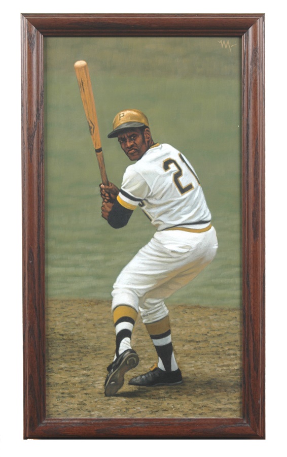 This stunning 11x18" oil on board painting of legendary baseball player Roberto Clemente by famed sports artist Arthur K. Miller shows the stoic Clemente winding up for a powerful swing of his bat. Miller's work has been featured at the National Baseball Hall of Fame, National Pastime Gallery, and numerous other prestigious sports art galleries.
