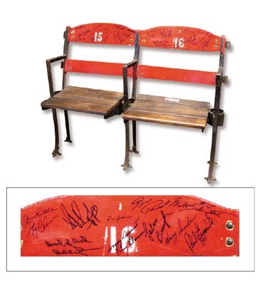 Fabulous seat is a double in red with original paint. Obtained directly from the Garden it comes with their accompanying LOA. Numbers 15 and 16 on the seat backs in original white paint, Boston Bruins greats are signed in mint black sharpie on one side, Celtics greats on the other. Bruins (11): Jean Ratelle, Gerry Cheevers, Ray Borque, Bobby Orr, Tom Johnson, Woody Dumart, Ferny Flaman, Brad Park, Milt Schmidt, John Bucyk, & Phil Esposito. Celtics (12): Jo Jo White, Ed McCauley, Dave Cowens, Red Auerbach, Nate Archibald, Sam Jones, Tom Heinsohn, KC Jones, Jack Ramsey, Bill Walton, Bill Sharman &John Havlicek. Seat is EX.