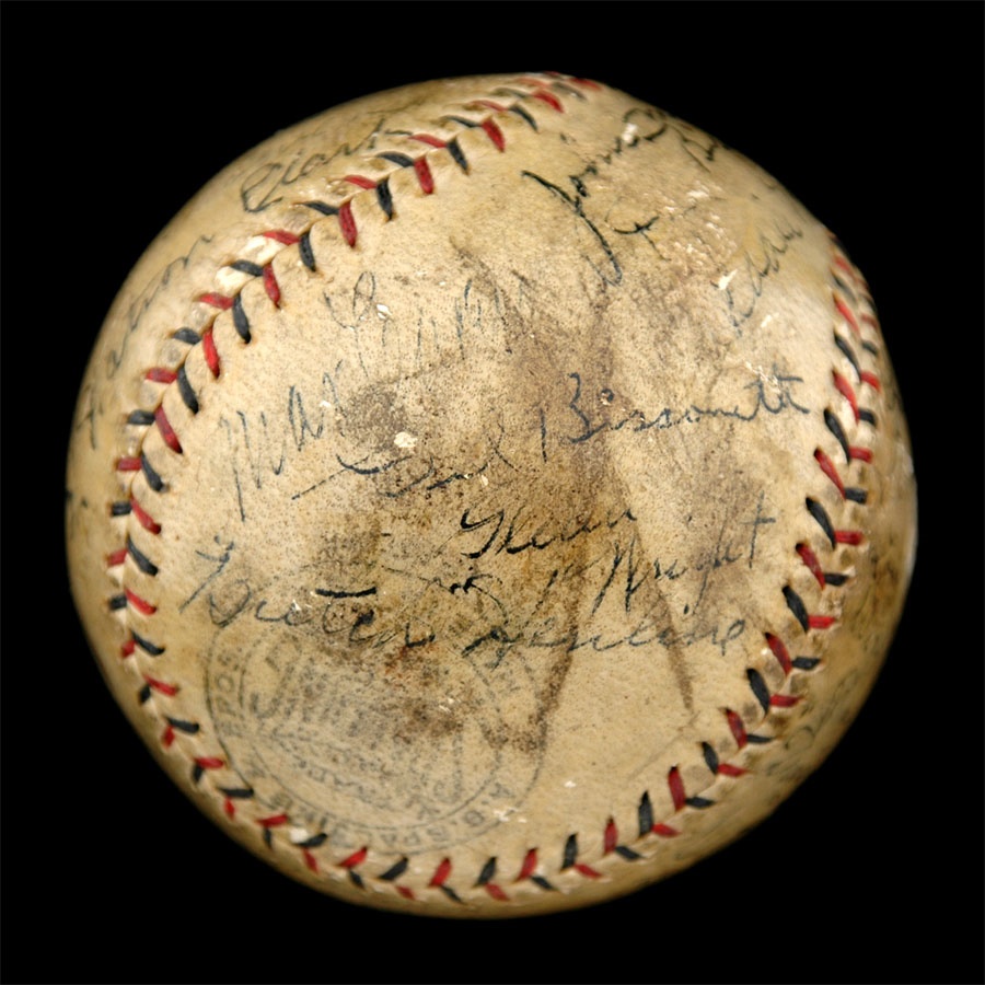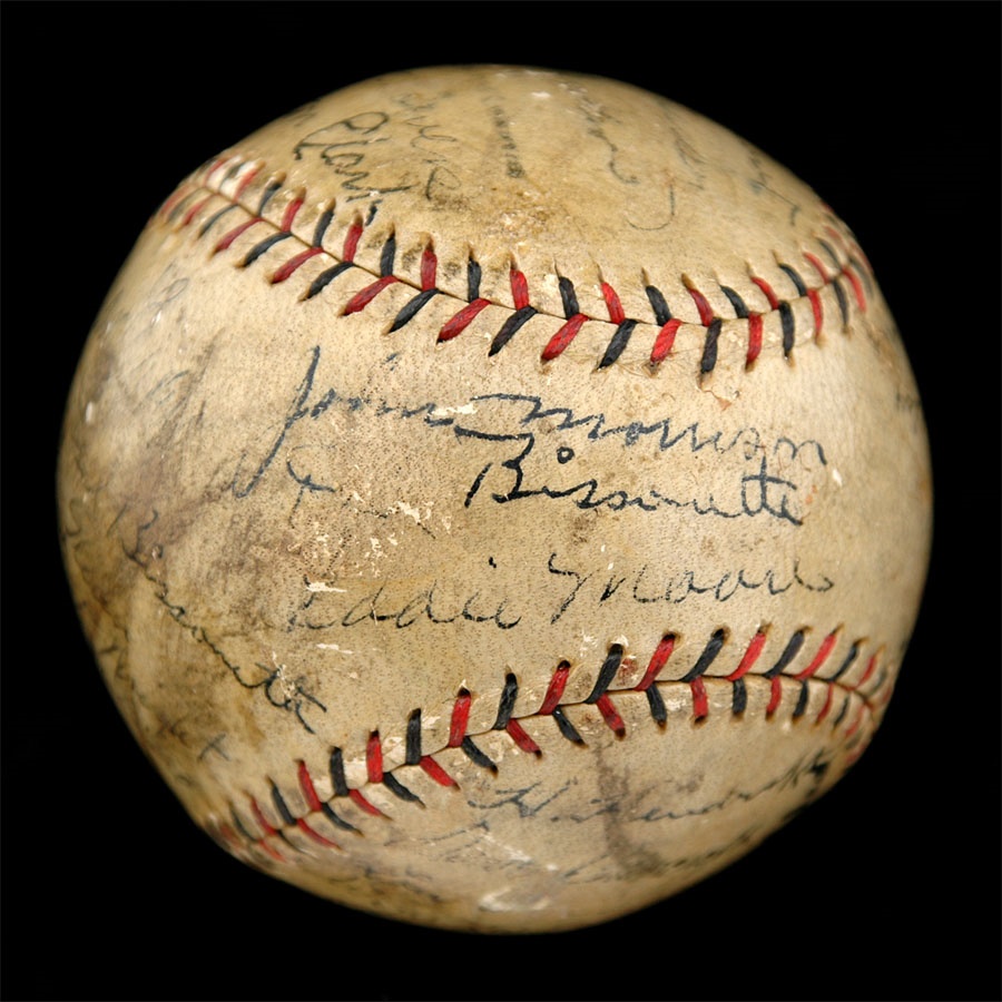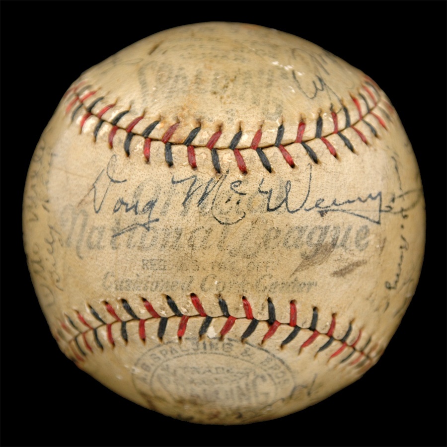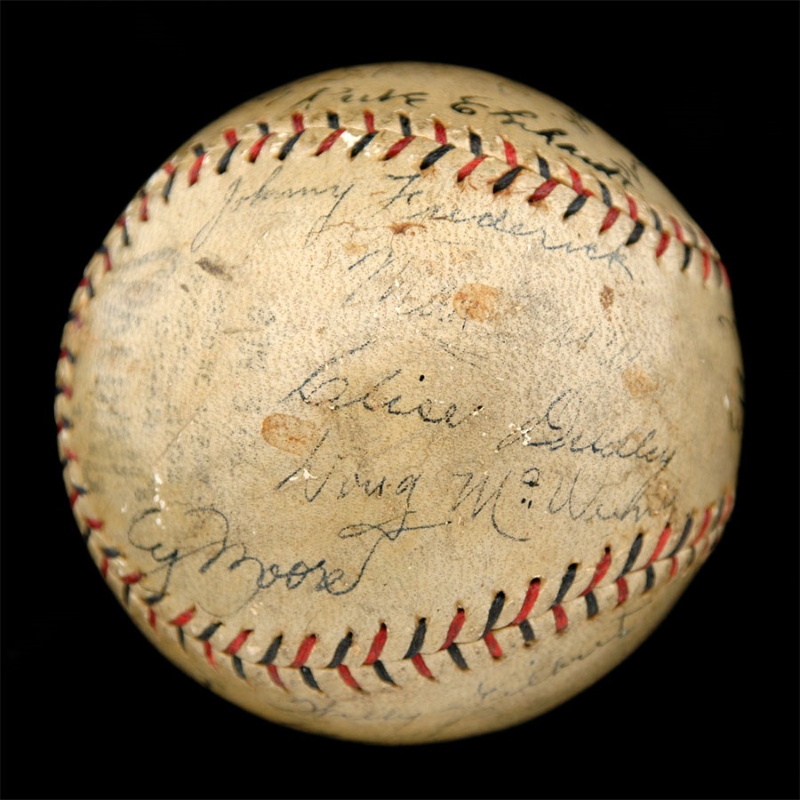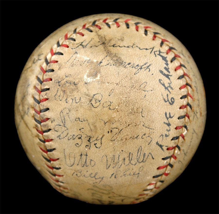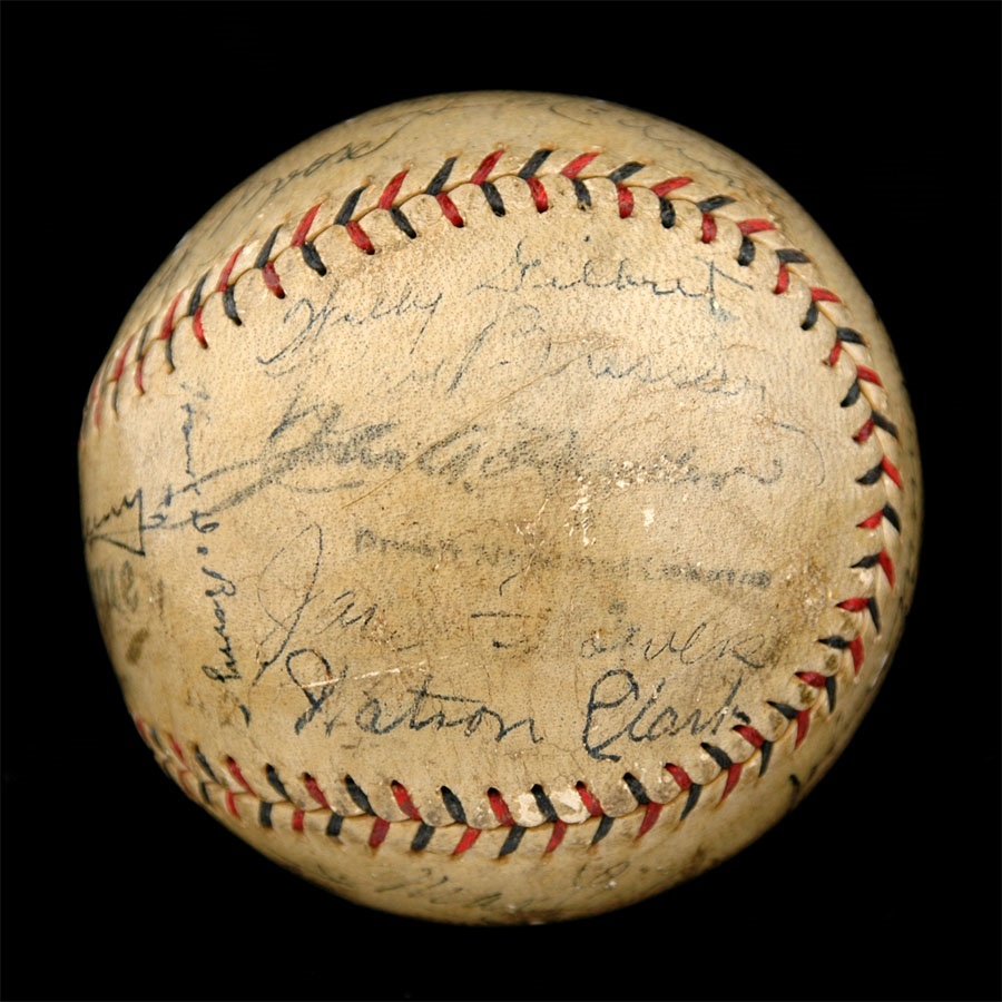 29 members of the 1929 Brooklyn Robins applied their signatures to this official National League (Heydler) baseball in 1929. Among the notable players are Max Carey, Dave Bancroft, Eddie Moore, Dazzy Vance and Johnny Frederick, who paced the club in home runs that season. A light coat of shellack has preserved the ink signatures to an average grade of 5-6/10. The ball, which features red and blue stitching, has faded labeling but is still in VG condition.