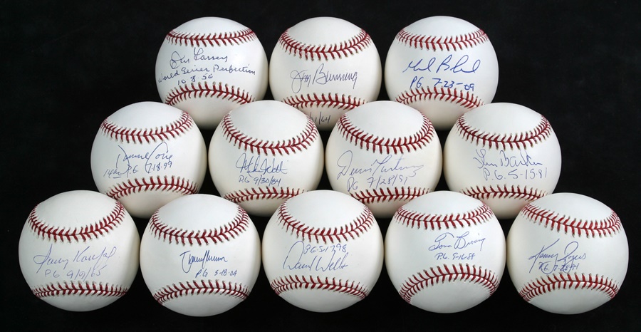 Twelve of the 20 pitchers who authored perfect games are represented here on NRMT official Major League baseballs. They include; Jim Bunning, Mike Witt, Len Barker, Kenny Rogers, Dennis Martinez, David Cone, Mark Buehrle, Randy Johnson, David Wells, Tom Browning, Sandy Koufax and Don Larsen, the only pitcher to achieve the feat during the postseason. All of the autographs include the dates of the perfectos in the pitchers' own hands, with Larsen including: "WORLD SERIES PERFECTION." The signatures are in ballpoint pen and avserage 8-9/10.