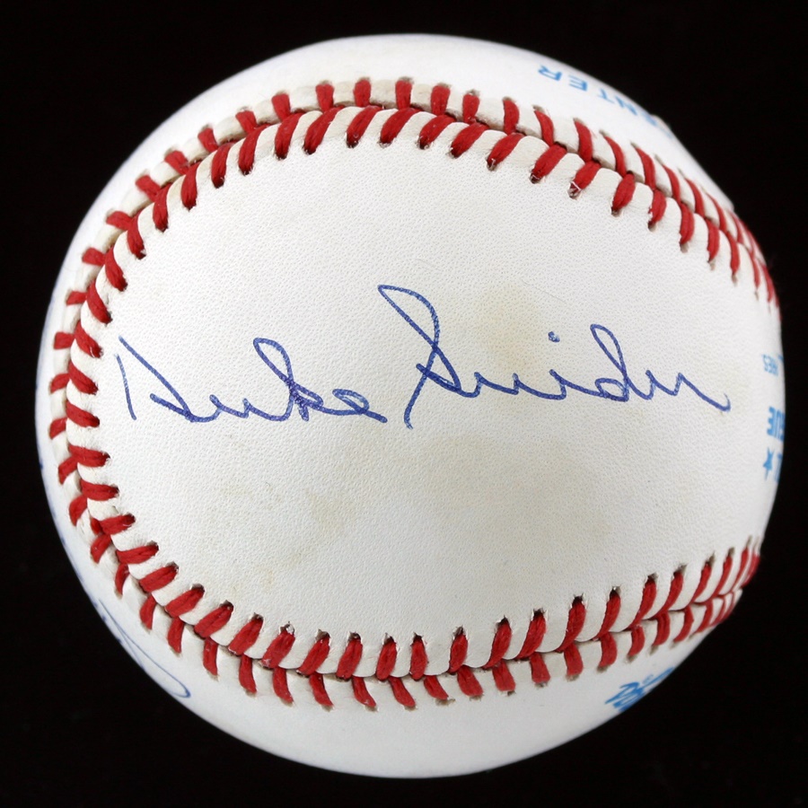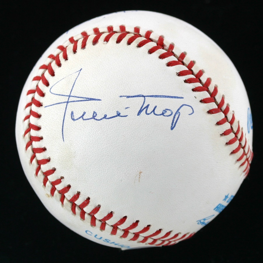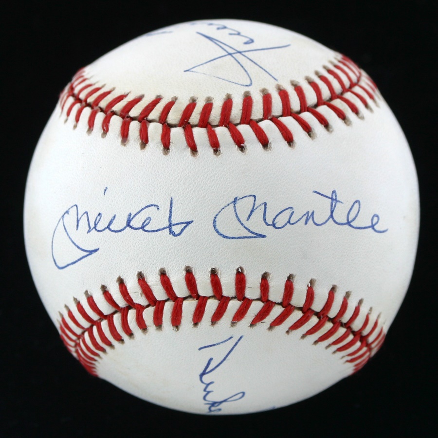 The climax of New York City baseball was the 1950s, when not two but three teams split the city's allegiances, and Subway Series were commonplace in October. But fans not only made arguments for their favorite club, they also became embroiled in another heated debate: which of the three Hall of Fame center fielders was the best? Willie Mays of the Giants, Mickey Mantle of the Yankees or Duke Snider of the Dodgers? All three greats autographed this official American League (Brown) baseball, which is in NRMT condition despite some very, very mild toning. All three legends signed their names in 8/10 blue ballpoint pen and there is a PSA sticker affixed to the ball. PSA LOA.