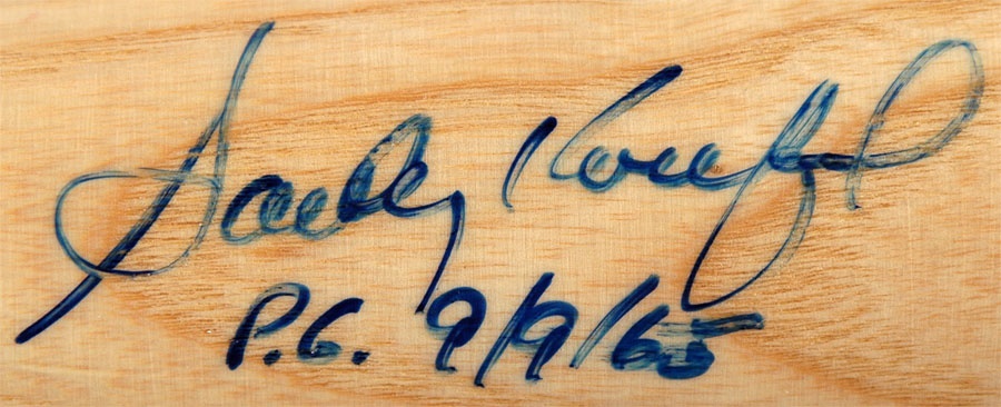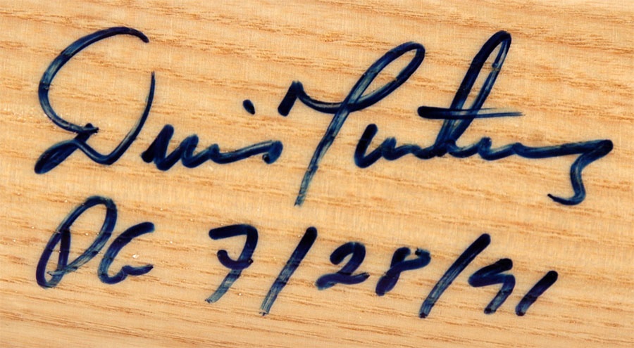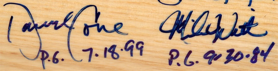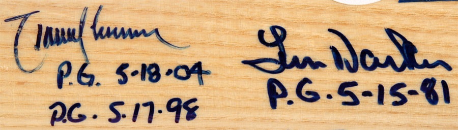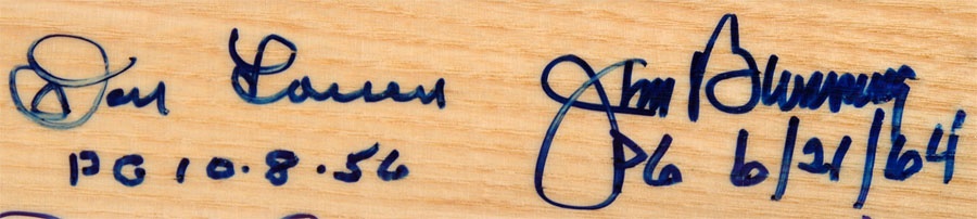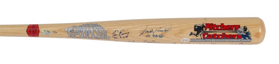 One of the rarest feats in baseball is the perfect game, of which there have only been 20 instances heading into the 2011 season. More than half of the pitchers who have achieved the feat - 11 in total - have autographed this special, NRMT bat from the Cooperstown Bat Company, which only manufactured 15 (this is #2 of 15). Overall, 12 of the 20 perfect games are accounted for here. The signatures are from Jim Bunning, Sandy Koufax, Dennis Martinez, Len Barker, Don Larsen (the only one to throw a perfect game in the postseason), Tom Browning, Mike Warren, David Cone, Kenny Rogers, David Wells and Randy Johnson, who turned the trick twice. Each pitcher but Wells includes the date of his gem(s) under his name, and the signatures average 8/10.