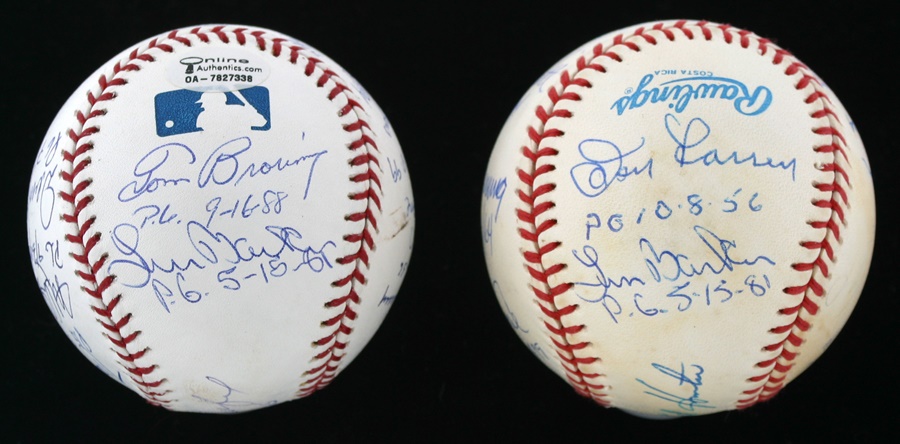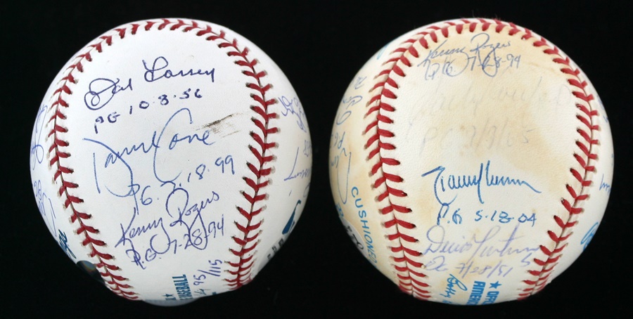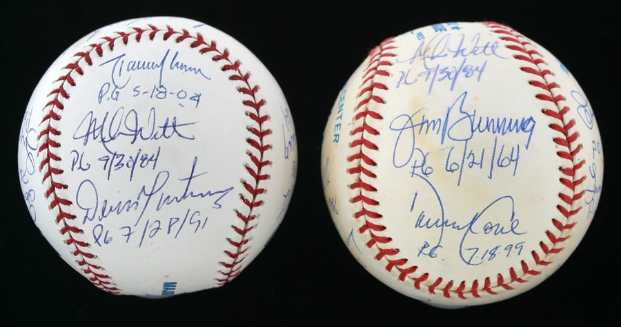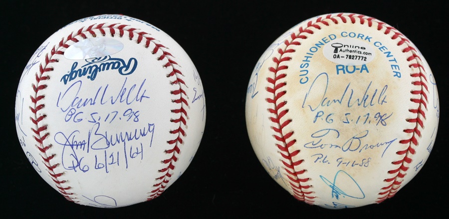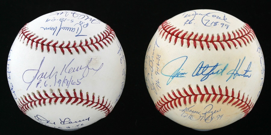 The pitching enthusiast had better not pass up on these two stunning baseballs featuring the signatures of numerous Perfect-game hurlers. Both balls feature similar signatures. Ball number one is a NRMT Rawlings Official MLB ball (Bud Selig) featuring 11 signatures, including David Cone, Kenny Rogers, Randy Johnson, Mike Witt, Don Larsen, Sandy Koufax and more, with all signatures rating a 8-9/10. The second ball is an EX Rawlings Official American League Ball (Bobby Brown) with slight toning and the signatures of David Wells, Jim Bunning, Don Larsen, Catfish Hunter, Sandy Koufax, and more, with an average signature rating of 7/10, except for the Koufax which is faded. All signatures except Hunter/Koufax have the dates of each game.